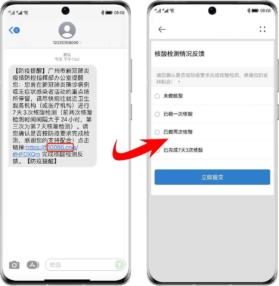 在不支持 5G 消息的手机上,5G 消息会自动调整为传统短信形态,用户点击文本短信中的链接同样可以跳转到收集界面,快速反馈核酸检测情况。防疫提醒短信中的链接域名均为 10086.cn,收到短信的人员可放心点击链接,如实完成信息反馈工作,协助防疫部门尽快掌握核酸检测情况。