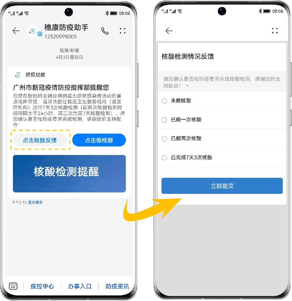 在支持 5G 消息的手机上,用户可以收到图文并茂的富媒体卡片 5G 消息防疫提醒,点击核酸检测反馈按钮,即可一键反馈核酸检测情况。